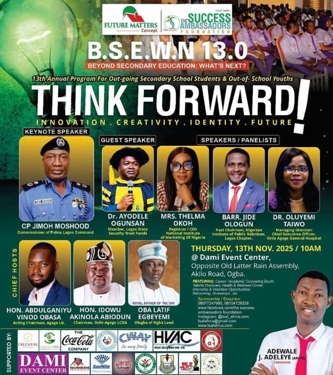 Join us for the 13th Edition of B.S.E.W.N โ an inspiring and transformative annual event designed for Senior Secondary School 3 students and out-of-school youths. Explore what's next in education, career pathways, and personal development in a vibrant environment on Akilo Road, Ogba, Ikeja, Lagos. Engage with industry experts, participate in insightful discussions, and network with like-minded peers. This event promises a day full of learning, motivation, and opportunities to shape your future! ๐โจ