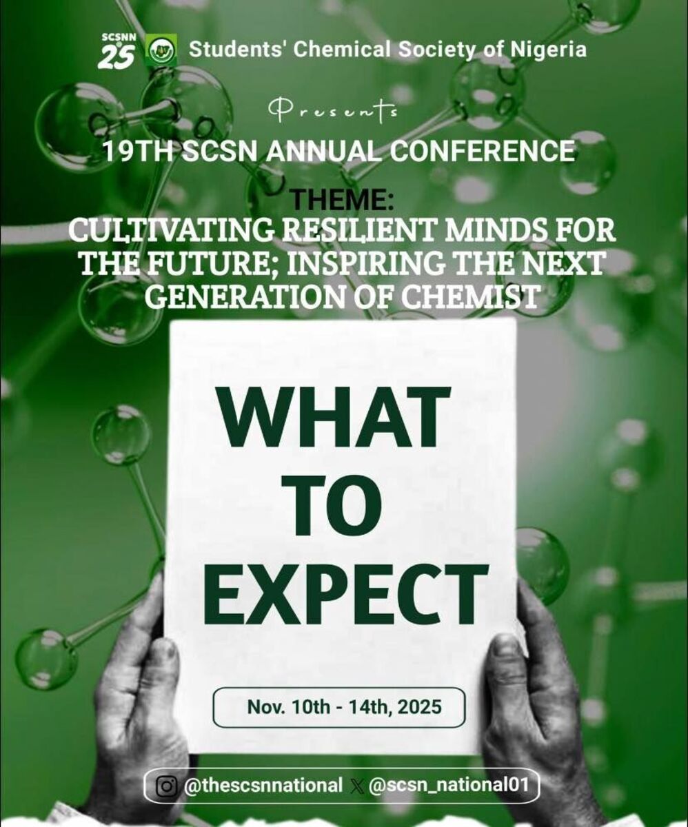 ๐ Join us at the 19th SCSN Annual Conference, a premier event organized by the Studentsโ Chemical Society of Nigeria (SCSN). This conference brings together brilliant young minds in chemistry to explore innovations, share knowledge, and foster resilience among future chemists. ๐