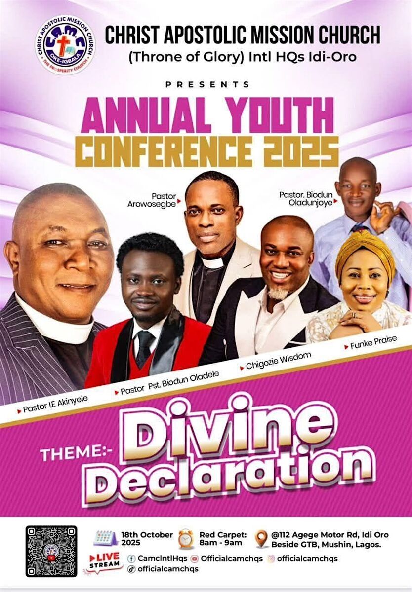 ๐ Join the vibrant gathering of young believers at the 2025 Annual Youth Conference hosted by CAMC International HQ! ๐ This event promises an inspiring atmosphere filled with motivating speakers, engaging sessions, and uplifting praise and worship. Whether you're looking to grow spiritually, connect with like-minded youth, or simply be part of a dynamic community, this conference is the place to be. Located at 112 Agege Motor Rd, Lagos, itโs a perfect opportunity to expand your horizons and make meaningful connections. Donโt miss out on this exciting day of learning, growth, and fellowship! ๐โจ