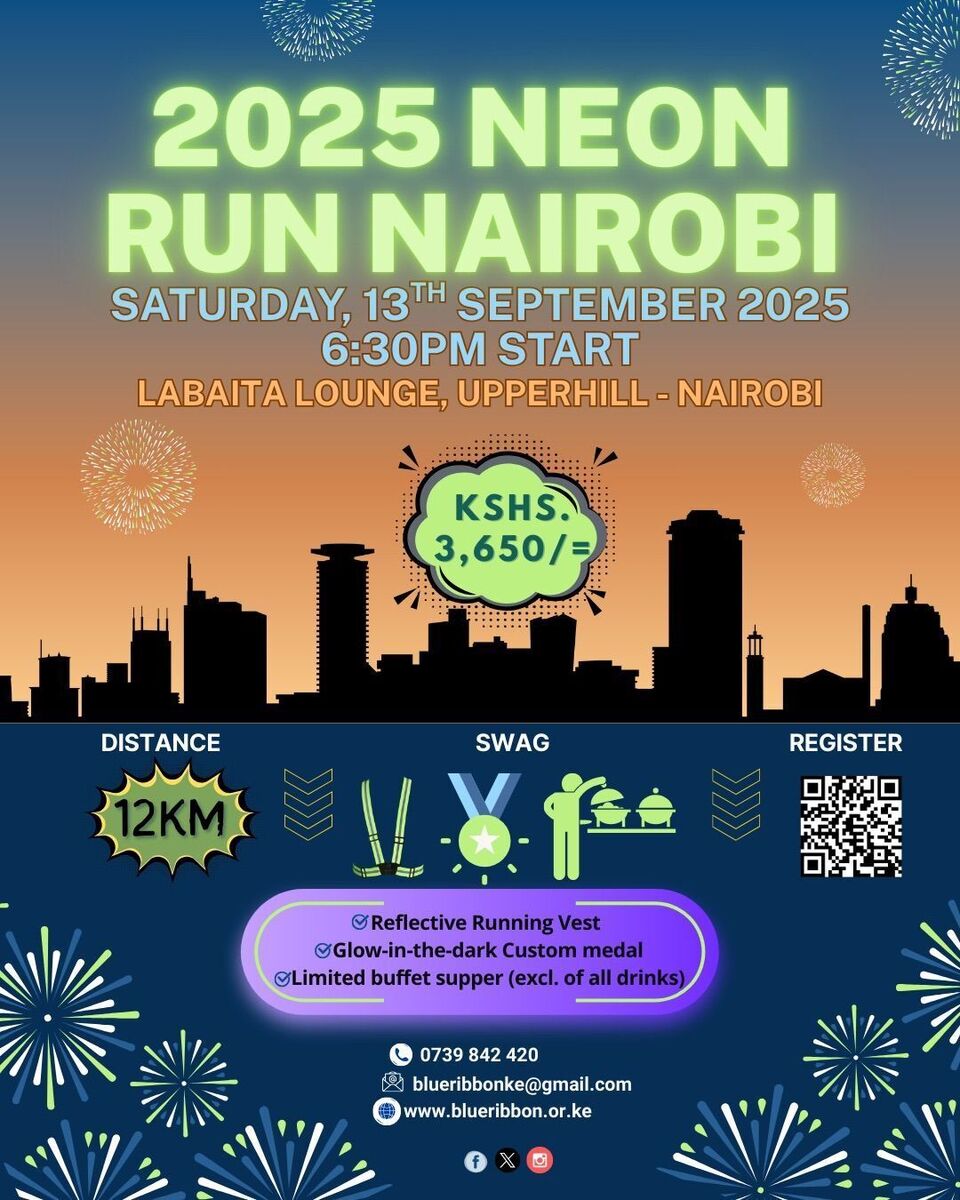 💃🕺 Nairobi's about to get lit (literally) with the 2025 Neon Run Nairobi — a dazzling 12-kilometer glow-in-the-dark adventure! Participants will enjoy a vibrant night of glowing fun, finishing with a custom meda, buffet bites, and unforgettable vibes. Whether you're a night owl or a glow enthusiast, this event promises a luminous experience filled with energy and excitement! 🎉✨