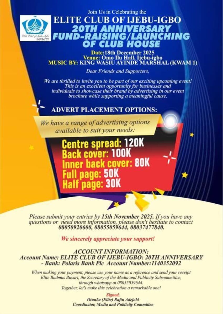 ๐ Celebrate a milestone with the 20th Anniversary and Fundraising Event of the prestigious Elite Club of Ijebu Igbo! Join us for an inspiring gathering filled with commemorations, networking, and opportunities to support a noble cause. The event promises engaging activities, heartfelt speeches, and a chance to connect with community leaders and members. Whether you're a proud member, a supporter, or a curious guest, this celebration is a perfect occasion to honor tradition and foster future growth. Don't miss out on this memorable event that brings people together for a noble purpose! ๐โจ