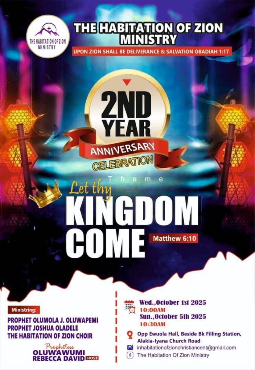 🎉 You're Invited! Join us in celebrating a momentous milestone — the 2nd Year Anniversary of Habitation of Zion. Experience a divine atmosphere filled with worship, deliverance, and divine encounters. This is a time to come together in faith, power, and unity as we declare God's Kingdom on earth.