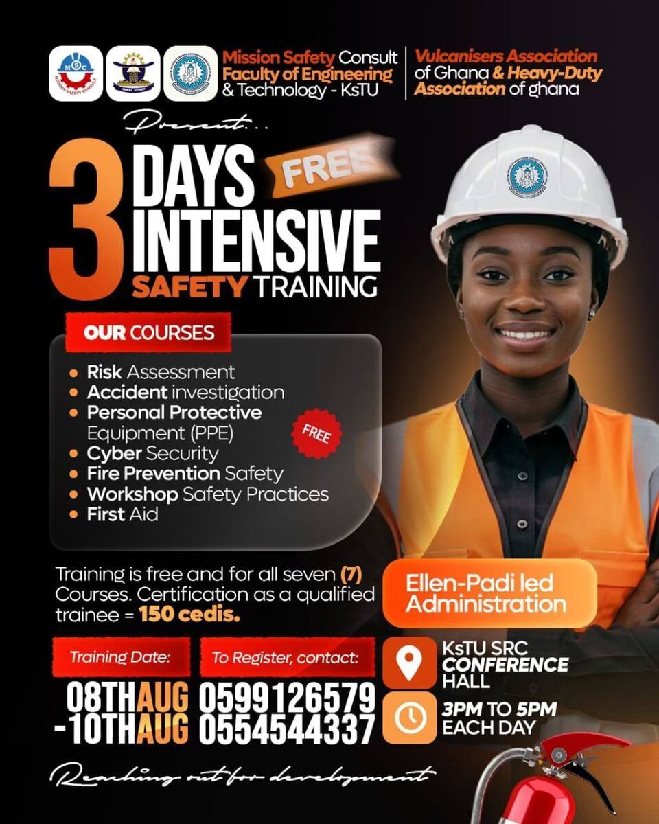 🚧 Join us for an immersive 3-day safety training session tailored for Kumasi Technical University engineering students! This intensive program is designed to equip participants with practical safety skills and a thorough understanding of safety protocols essential for engineering environments. Whether you're a student eager to enhance your safety knowledge or a professional seeking to upgrade your skills, this event offers a comprehensive hands-on experience.