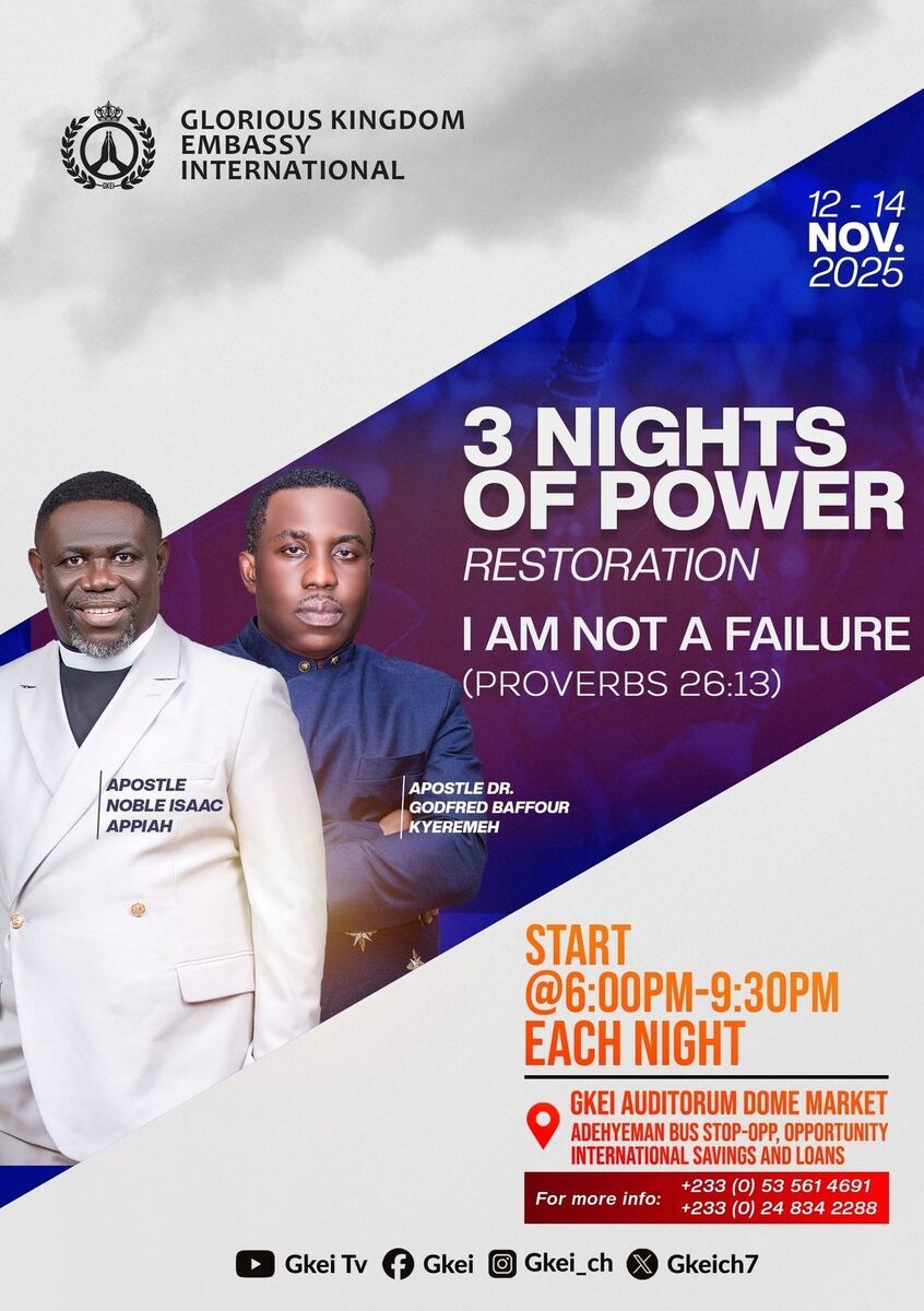 Get ready for an electrifying experience at the 3 Nights of Power Restoration event! Join us for three nights of inspiring sessions dedicated to revitalizing the spirit and power of the community. Held at the iconic Dome in Accra, this event promises engaging activities, impactful messages, and a chance to connect with like-minded individuals seeking positive change. 🎉✨ Whether you're passionate about faith, community upliftment, or just looking for an uplifting experience, this event is perfect for you! Don’t miss out on this spiritual and communal revival that will energize your soul and renew your purpose. 🔥🙌