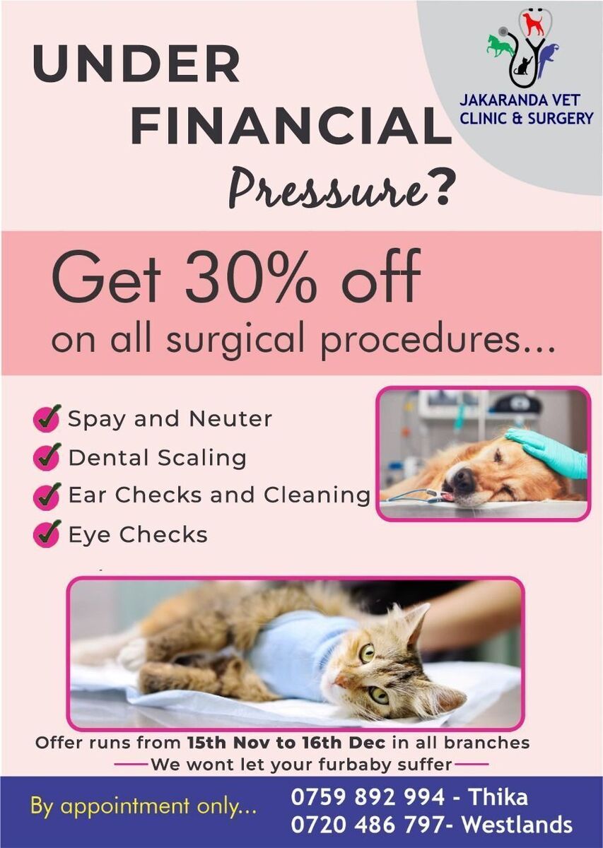 Experience a special opportunity to care for your beloved animals with a generous 30% discount at Jakaranda Vet Clinic & Surgery - Thika Branch! ๐พโจ This event highlights the importance of providing quality healthcare for pets, emphasizing compassion and professionalism. Whether youโre a pet owner or animal lover, this is the perfect chance to get expert veterinary services at a reduced rate. Enjoy engaging activities, learn about pet health, and connect with caring professionals dedicated to your animalโs well-being. Donโt miss out on this seasonโs exclusive veterinary promotion designed to keep your furry friends happy and healthy! ๐๐ถ๐ฑ