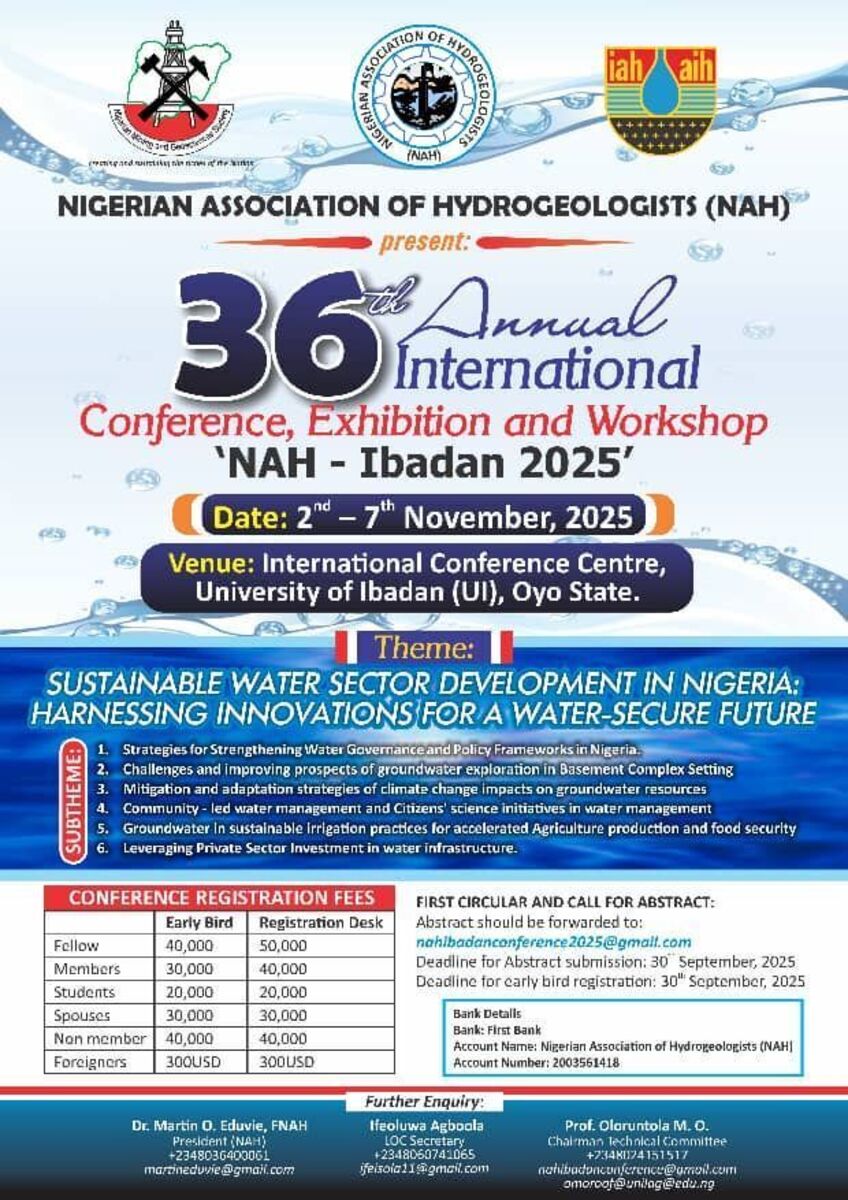 Join us for the 36th Annual International Conference, Exhibition, and Workshop organized by the Nigerian Association of Hydrogeologists. This premier event offers a unique platform for professionals, researchers, and stakeholders in the water sector to collaborate, share innovations, and discuss sustainable water development strategies in Nigeria. ππ§