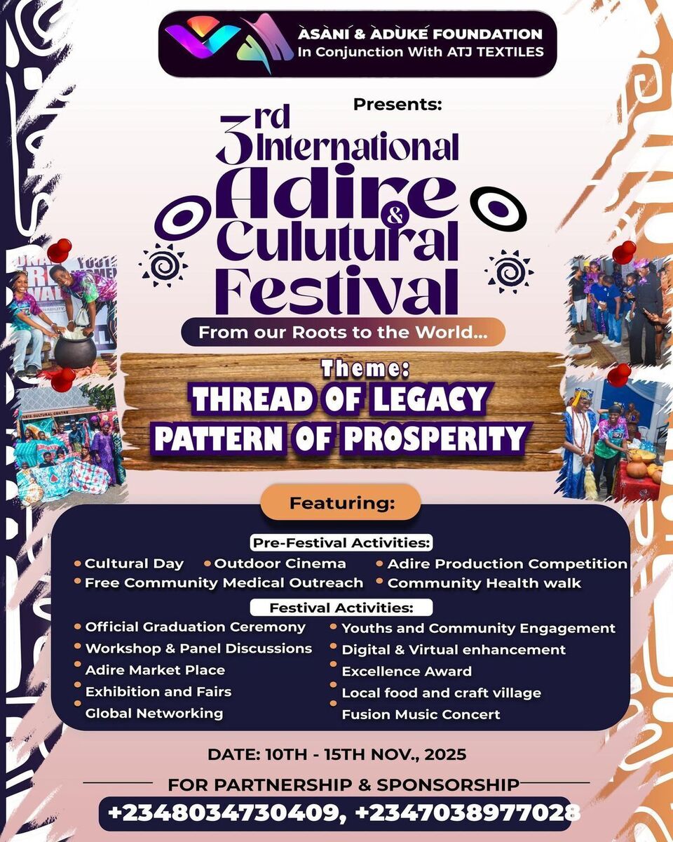 Join us at the 3rd International Adire and Cultural Festival—a vibrant celebration of traditional textile arts and rich cultural heritage! 🎉 Immerse yourself in colorful displays of Adire fabric, vibrant performances, lively cultural exhibitions, and engaging workshops. This festival is a unique opportunity to experience the beauty of Nigerian craftsmanship, music, dance, and community spirit—all in one exciting event. Whether you're an art lover, cultural enthusiast, or curious visitor, there's something special for everyone to enjoy! 🌍✨
