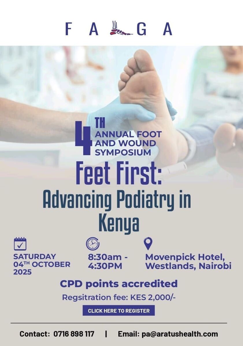 Join healthcare professionals and nurses at the 4th Annual Foot and Wound Symposium in Nairobi! This engaging event is dedicated to advancing knowledge in wound care, diabetic foot management, and surgical skills that significantly improve patient outcomes. Whether you're a specialist or a student, this symposium offers valuable insights, latest research, and practical skills to enhance your practice. Don't miss the opportunity to network with peers and experts in the field. Secure your spot now and be part of this essential healthcare gathering! 🚑👣
