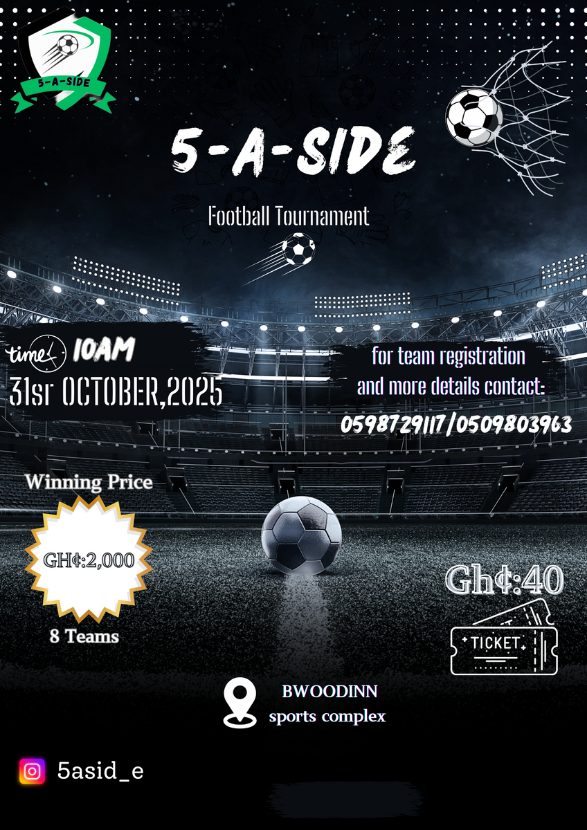 A football tournament happening on the 31st of october,2025 at bwoodinn sports complex come in your numbers and let’s have fun together..see you there