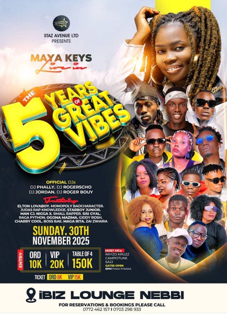Join us for an unforgettable musical celebration! ๐ถ 5 Years of Great Vibes with Maya Keys is set to light up NEBBI TOWN, Kampala, with a vibrant live concert experience. Dive into an evening filled with soulful performances, energetic DJ sets, and a lively atmosphere that promises to keep the good vibes rolling all night long. From top local artists to special hosts, this event is a perfect blend of music and merriment. Whether you're a fan of live performances or looking to dance the night away, this concert is the place to be! ๐นโจ