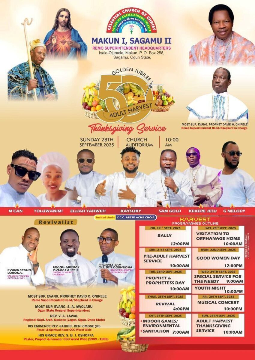 Join us at the 50th Golden Jubilee Adult Harvest celebration, a historic milestone marking five decades of God's faithfulness. This grand event is a perfect opportunity to give thanks, rejoice, and celebrate the journey of faith and community. Expect inspiring worship, heartfelt thanksgiving, and a vibrant gathering of believers and friends. Come and be part of this memorable milestone as we honor God's goodness over the years! 🌟🙏