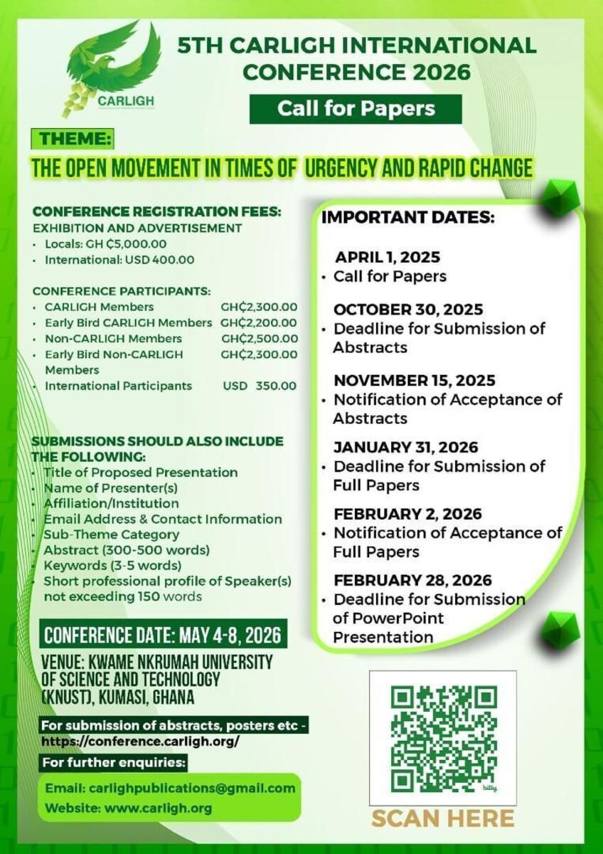 🌍 Join Thought Leaders and Researchers at the 5th CARLIGH INTERNATIONAL CONFERENCE! This premier event brings together academics, librarians, and information professionals to explore the theme “The Open Movement In Times of Urgency and Rapid Change.” Engage in insightful presentations, collaborative discussions, and innovative solutions designed to shape the future of knowledge sharing. Whether you're a scholar, a practitioner, or an enthusiast, this conference offers a unique platform to network, learn, and contribute to the global dialogue on open access and information democratization. Don't miss the extended deadline to submit your papers and be part of this impactful gathering! 🚀✨