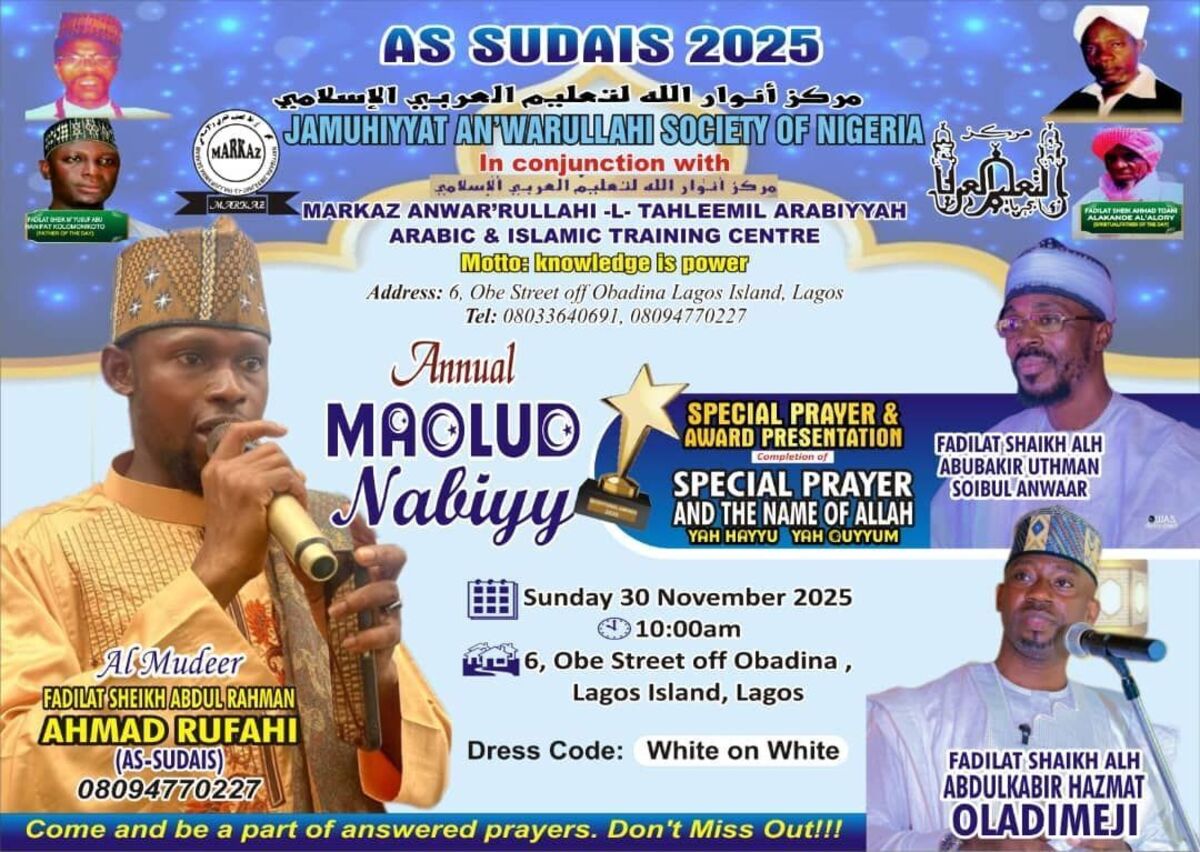 π Welcome to the AS SUDAIS 2025 event! Join us for an exciting gathering at the iconic 6 Obe Street Lagos Island. This event is a perfect opportunity to connect, celebrate, and enjoy unforgettable moments with fellow attendees. Expect a vibrant atmosphere filled with engaging activities, inspiring speakers, and a lively community spirit. Don't miss out on the fun, networking, and cultural experience that awaits! π
