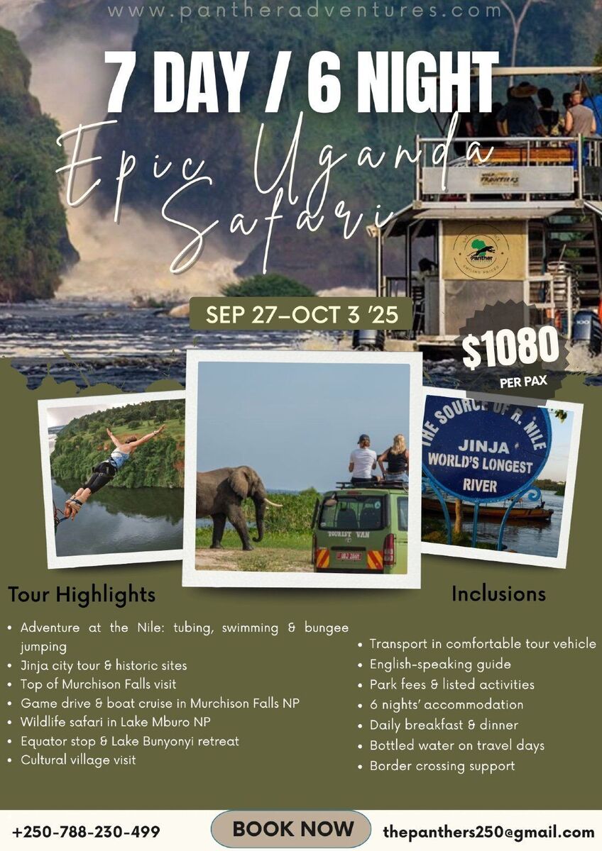 Embark on an unforgettable week-long adventure through Uganda with Panther Adventures! Experience the thrill of adrenaline-packed activities like water tubing, swimming, and bungee jumping at the iconic Source of the Nile in Jinja. Explore the rich wildlife in Murchison Falls and Lake Mburo National Parks, relax by the serene Lake Bunyonyi, and immerse yourself in Uganda's vibrant culture. This safari offers a perfect blend of adventure, nature, and cultural experiences, designed for explorers seeking both excitement and tranquility. 🌍✨