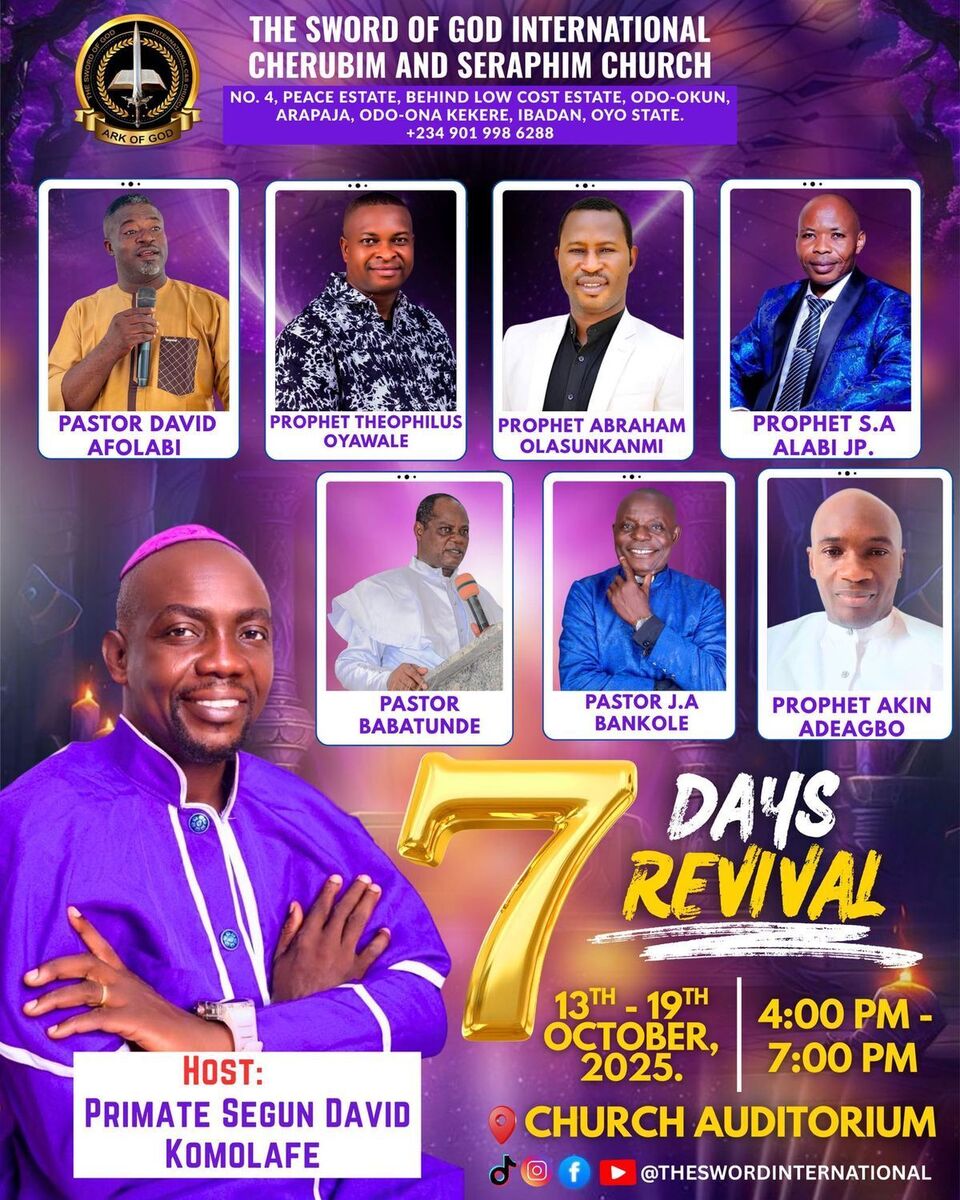 Join us at THE SWORD OF GOD INTERNATIONAL CHERUBIM AND SERAPHIM CHURCH for a powerful 7-day spiritual revival β a divine encounter designed to renew your spirit, ignite your faith, and bring breakthroughs! Experience days filled with prayer, worship, and divine power that will transform your life.