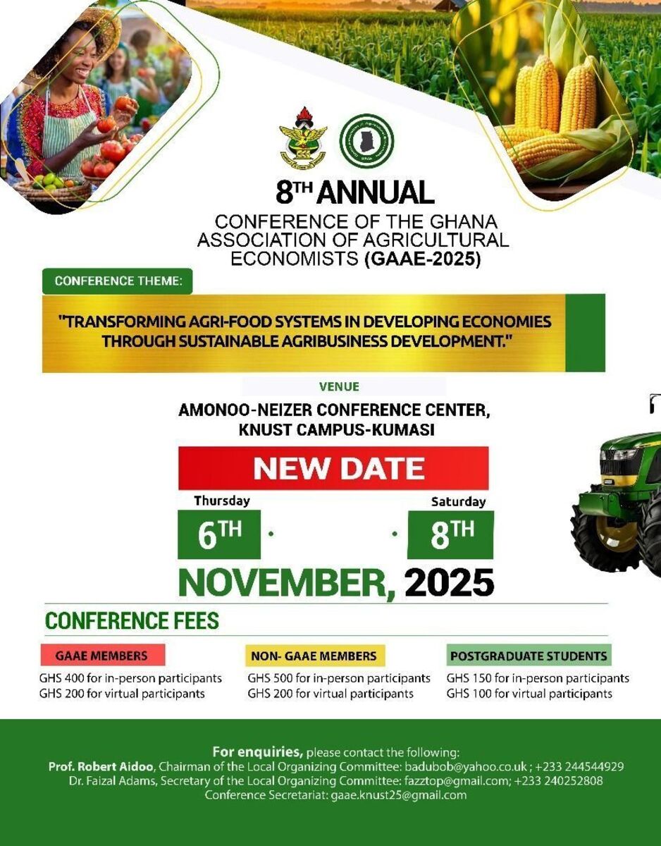 Join us for the 8th Annual GAAE Conference, a premier gathering of Ghanaian economists, researchers, academics, and industry professionals. This event offers a unique platform to explore the latest trends in agricultural economics, food security, and sustainable development. Engage in insightful sessions, network with leading experts, and participate in interactive workshops designed to enhance your knowledge and professional growth. Whether you're an industry veteran or a budding researcher, this conference promises valuable insights and opportunities for collaboration. Don't miss out on this impactful event that aims to drive resilience, innovation, and security in Ghana's agricultural sector! ๐ฑ๐ผ