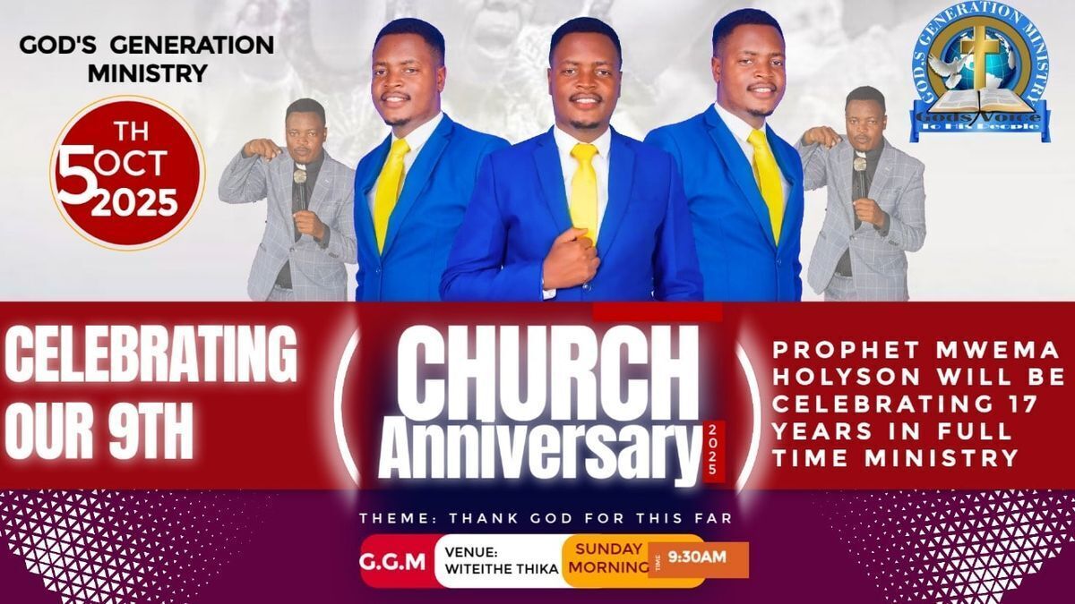 🎉 Celebration Time! Join us for a joyful and inspiring event as we mark the 9th Anniversary of God’s Generation Ministry (GGM) and 17 Years of Prophet Mwema Holyson’s Dedicated Ministry. This special day is a testament to God’s faithfulness, love, and the transformative power of His Word.