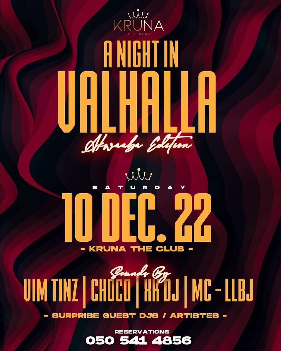 The very first Big Night in December. Join us on 10th December for a night in Valhalla Akwaaba 🔥Edition 🇺🇸 🇬🇧 Kruna the club is a whole vibe and experience ⚡️🥂 Save the date. Book your spot. December in Ghana is Kruna.