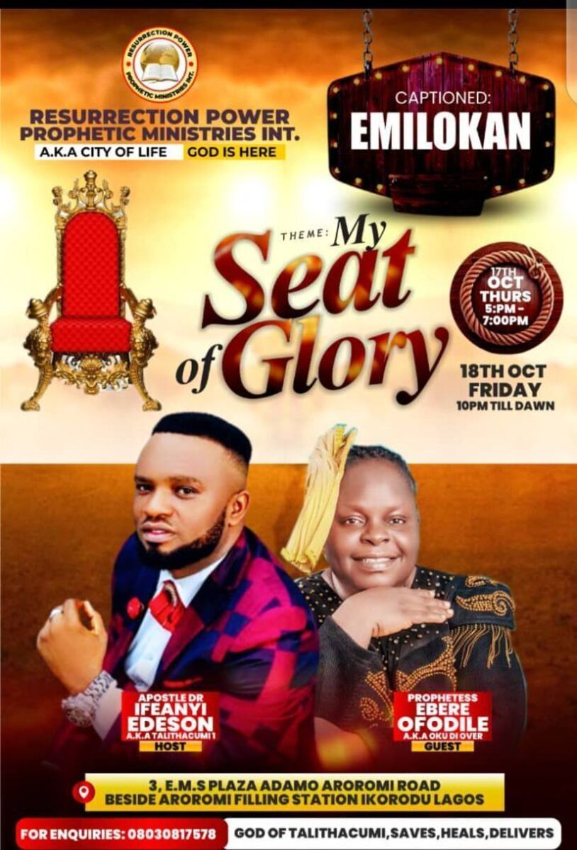 Join Resurrection Power Prophetic Ministries Lagos Talitha Cumi for an impactful spiritual gathering titled EMILOKAN. This event is a special opportunity for attendees to experience divine power and prophetic blessings. Themed MY SEAT OF GLORY, it promises an atmosphere charged with faith, prayer, and breakthrough. Participants will be blessed in a setting designed for spiritual upliftment and divine encounter. Don't miss this life-changing experience where God's presence is sure to manifest powerfully! ๐โจ