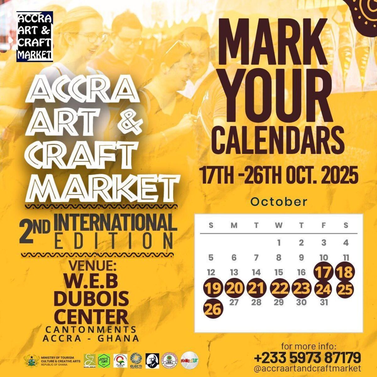 🎨✨ Dive into the vibrant world of arts and crafts at the Accra Art and Craft Market! Explore a rich tapestry of handmade artworks, cultural artifacts, and unique crafts created by talented local artisans. This event is a perfect opportunity to experience the creativity and heritage of Accra, indulge in shopping for authentic Ghanaian crafts, and immerse yourself in a lively atmosphere filled with color, music, and community spirit. Whether you're an art enthusiast, a collector, or simply looking for a memorable cultural experience, the market promises a delightful journey through Ghana's artistic soul. Don't miss out on this celebration of craftsmanship and culture! 🖌️🎉