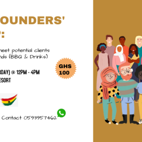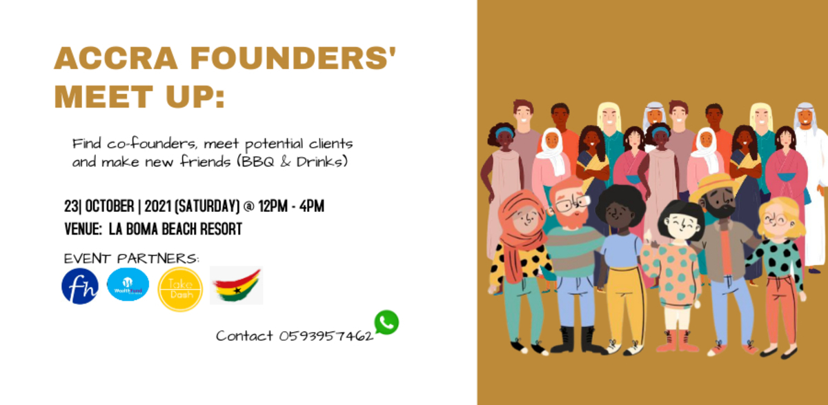 Accra Founders' Meet Up provides an opportunity for Company Founders working in a variety of industries to exchange ideas and experiences about Clients, Markets, Finances, HR, Productivity, Marketing and Sales, Structure, Leadership, PR, Investments etc.