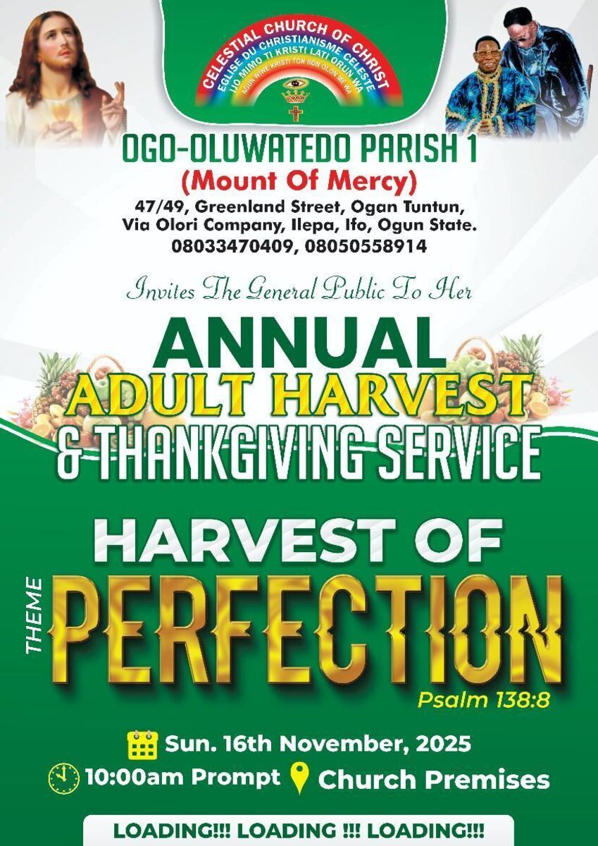 ๐ Join us for a grand celebration marking the Adult Harvest Anniversary! This special event is dedicated to honoring the achievements and milestones of our mature community. Expect an evening filled with inspiring speeches, uplifting performances, and a vibrant atmosphere that celebrates growth, unity, and success. Dress to impress and be part of an unforgettable experience where passion and purpose come together. Don't miss this opportunity to connect, reflect, and rejoice in a lively, engaging environment! ๐โจ