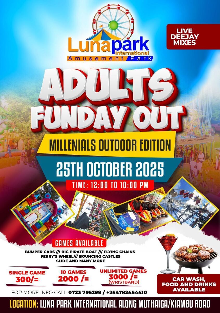 Join us for a lively outdoor event packed with activities designed to bring out the kid in everyone. Enjoy bumper car rides, a grand pirate boat adventure, towering Ferris wheel experiences, flying chains, bouncing castles, bungy trampoline, horse and camel rides, face painting, clown entertainment, delicious Nyama Choma, refreshing cocktails, and much more! 🍹🦀🧸