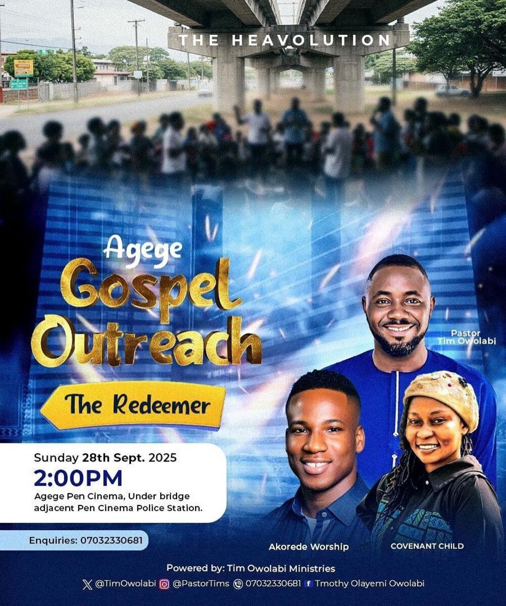Join us for a powerful Gospel Outreach in Agege! Experience the unconditional love of God, hear the transforming message of salvation, and receive healing and deliverance. This event promises a profound encounter with the Lord Jesus Christ.