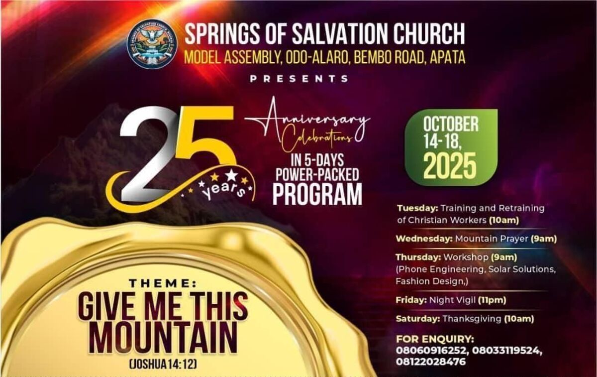 Join us for a powerful spiritual gathering at Springs of Salvation Church, Apata Assembly. This special program promises to be a power-packed event filled with divine blessings, uplifting worship, and life-changing messages. Whether you're seeking spiritual renewal or a moment of divine encounter, this event offers an opportunity for everyone to experience God's presence in a vibrant and welcoming atmosphere. Don't miss this chance to be part of an extraordinary spiritual experience that could transform your life. 🙏✨