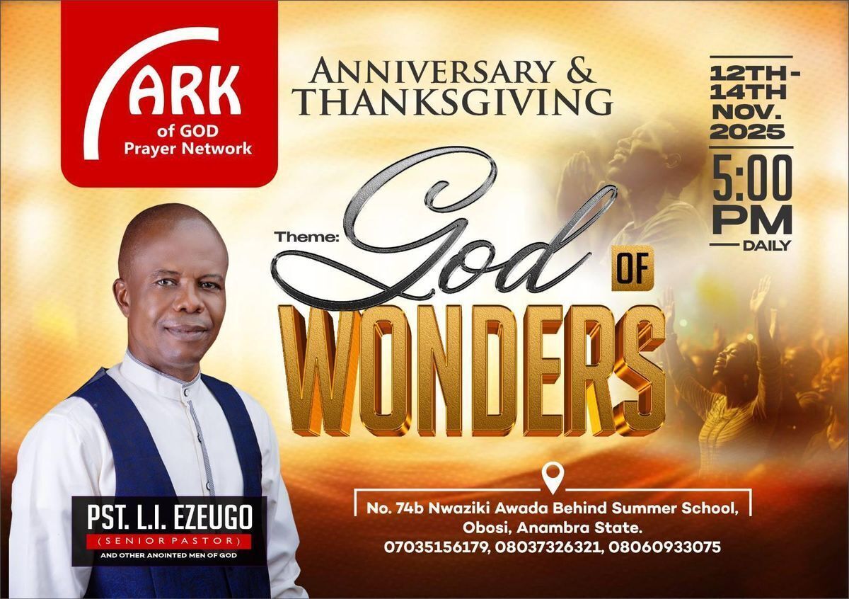 π Join us in celebrating a historic milestone! Ark Of God Onitsha Branch is marking its grand anniversary and Thanksgiving 2025. Experience a day filled with spiritual upliftment, vibrant worship, and community unity. This event promises inspiring sermons, heartfelt praises, and an atmosphere of joy and gratitude. Don't miss the chance to be part of a memorable spiritual gathering that unites faith and fellowship. ππ