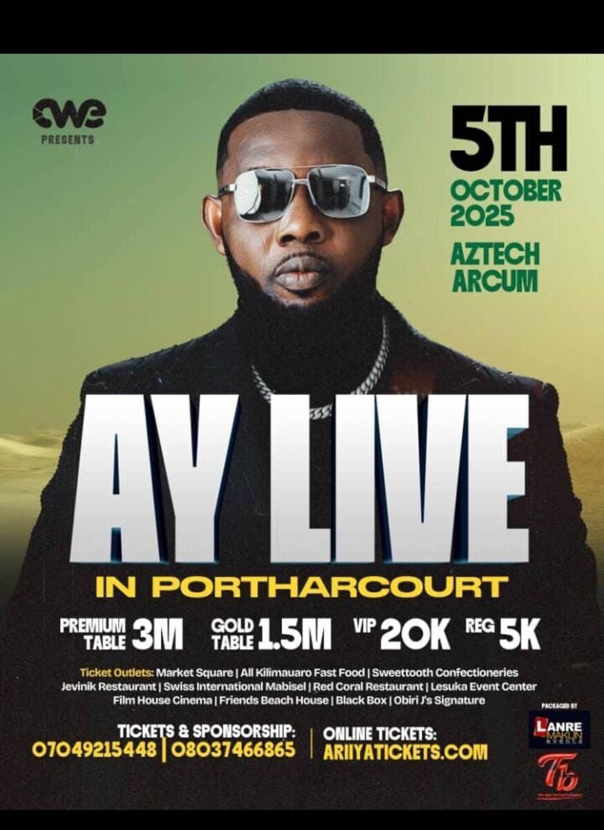 π Get ready for an unforgettable night of comedy, music, and entertainment at AY LIVE IN PORT HARCOURT 2025! Experience stellar performances by top artists and comedians in a vibrant atmosphere. This event promises to be a spectacular celebration of culture, laughter, and music, bringing together fans from all over Nigeria and beyond. Don't miss out on this grand entertainment extravaganza that will leave you energized and inspired! ππΆ
