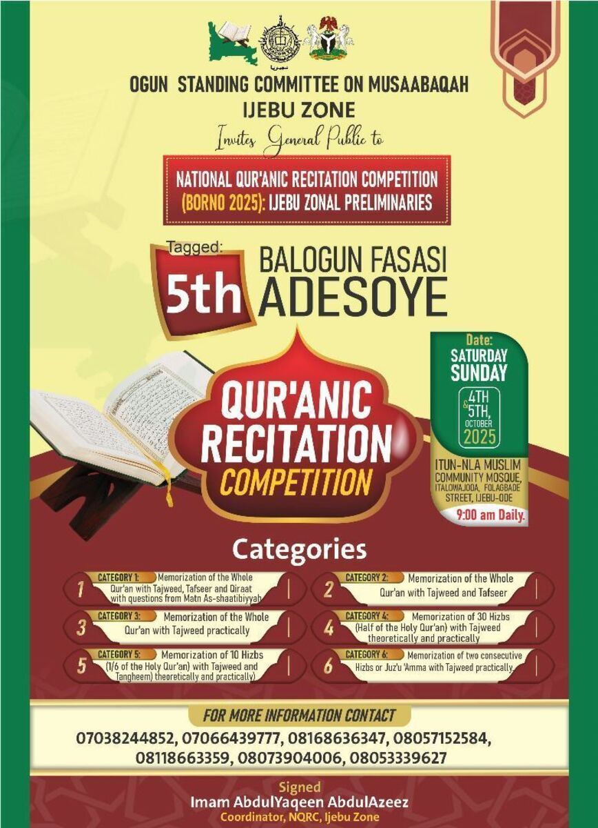 Join us for the Balogun Adesoye Musaabaqah, a vibrant event that celebrates Islamic knowledge and community. This occasion features a zonal musaabaqah (recitation contest) aimed at fostering spiritual growth, cultural pride, and unity among participants. Participants will showcase their memorization and recitation skills in a spirited competition designed to inspire and uplift. Whether you're a participant or a supporter, this event promises an engaging atmosphere filled with spiritual enrichment, camaraderie, and cultural expression. Don't miss this chance to be part of an inspiring gathering that highlights the rich traditions of our community. πβ¨