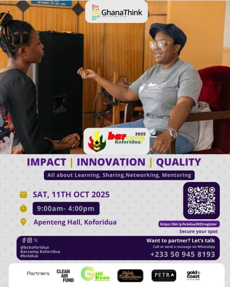 🔥 Join us for Barcamp Koforidua 2025 — a dynamic and free networking forum designed to bring together entrepreneurs, professionals, and changemakers for a day of learning, sharing, and mentoring. Under the theme "Impact | Innovation | Quality", this event promises an inspiring environment to explore new ideas, forge meaningful connections, and celebrate community achievements.