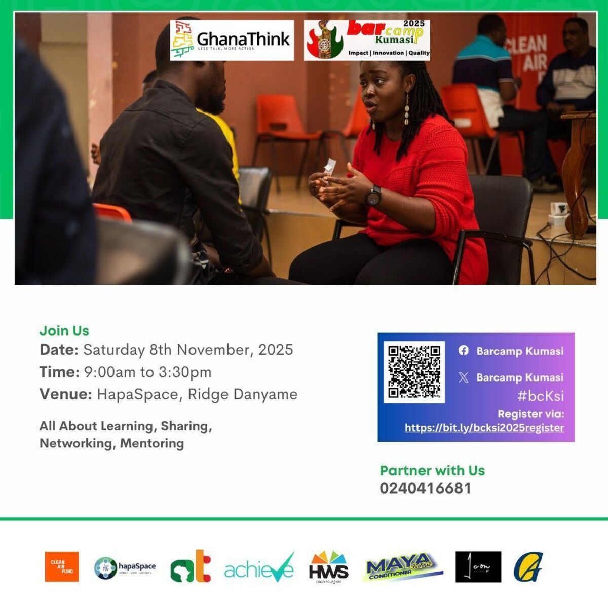 Join a vibrant network of changemakers, entrepreneurs, and innovators at Barcamp Kumasi 2025. Engage in a dynamic environment where learning, sharing, and networking come together to inspire action. Discover new ideas, connect with like-minded individuals, and get mentored in a collaborative setting. Whether you're a student, professional, or startup enthusiast, this event is your gateway to impact, innovation, and quality in Kumasi. Don't miss out on this opportunity to be part of a thriving community shaping the future! 🚀🌍