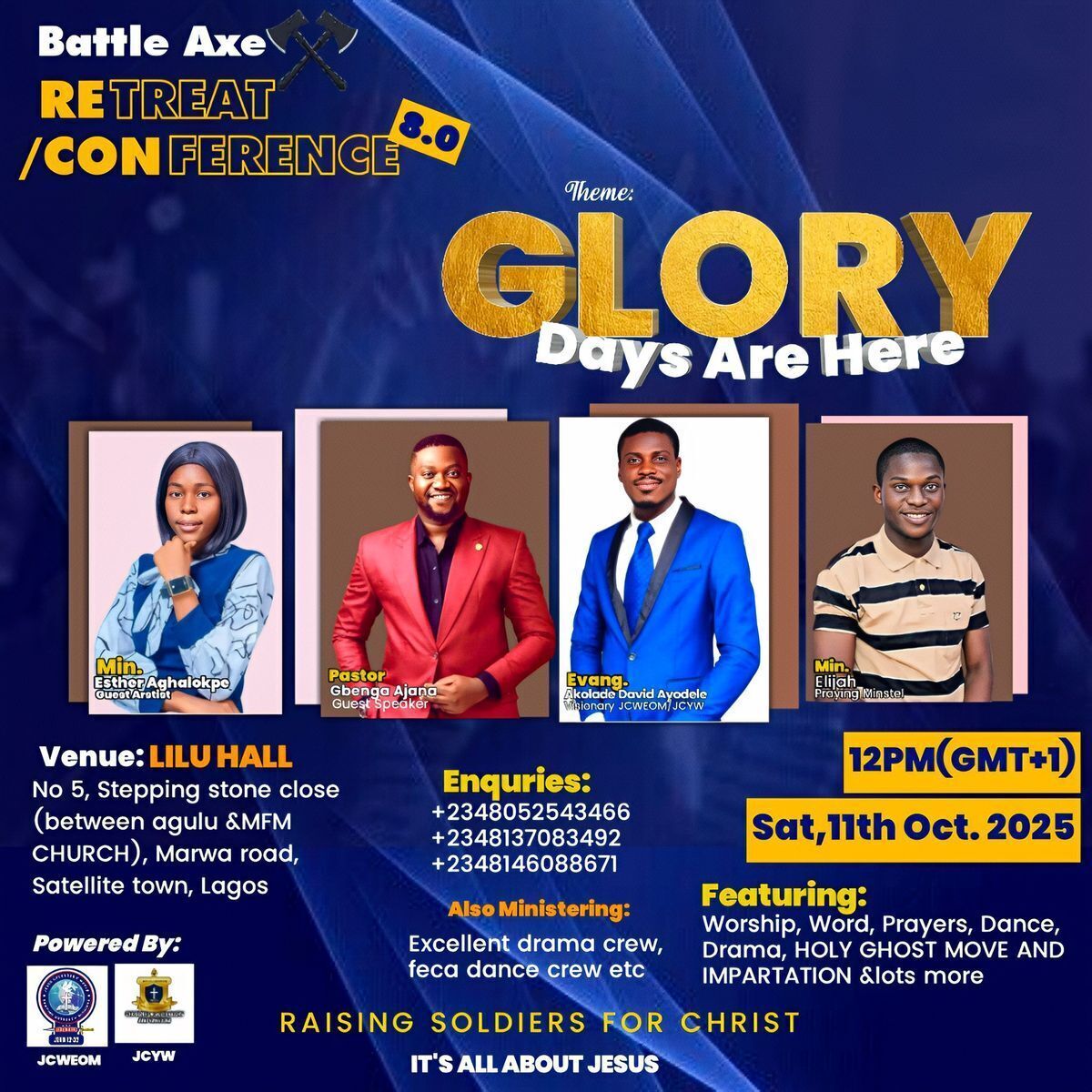 Join us for a powerful spiritual encounter at the BATTLE AXE RETREAT/CONFERENCE. This event promises an inspiring gathering featuring worship, the word, music, prayers, dance, drama, talent showcases, and Holy Ghost charge to move in salvation, healing, deliverance, miracles, signs, and wonders. Expect divine impartation and empowerment in an environment charged with God's presence.