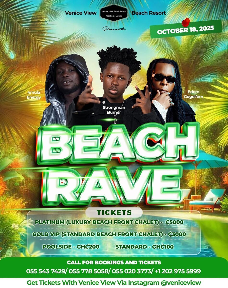 🎉 Get ready for an unforgettable beach party! Join us at Venice View Beach Resort for a electrifying Beach Rave featuring top artists like Strongman Burner, Edem Go Get Em, and Nzema’s own @4mulaEnergy. Experience the vibrant atmosphere, great music, and fun vibes by the seaside. Whether you're dancing under the stars or chilling with friends, this event promises an epic night of entertainment and enjoyment. Don’t miss out on this first-ever Beach Rave at Venice View! 🌊🔥