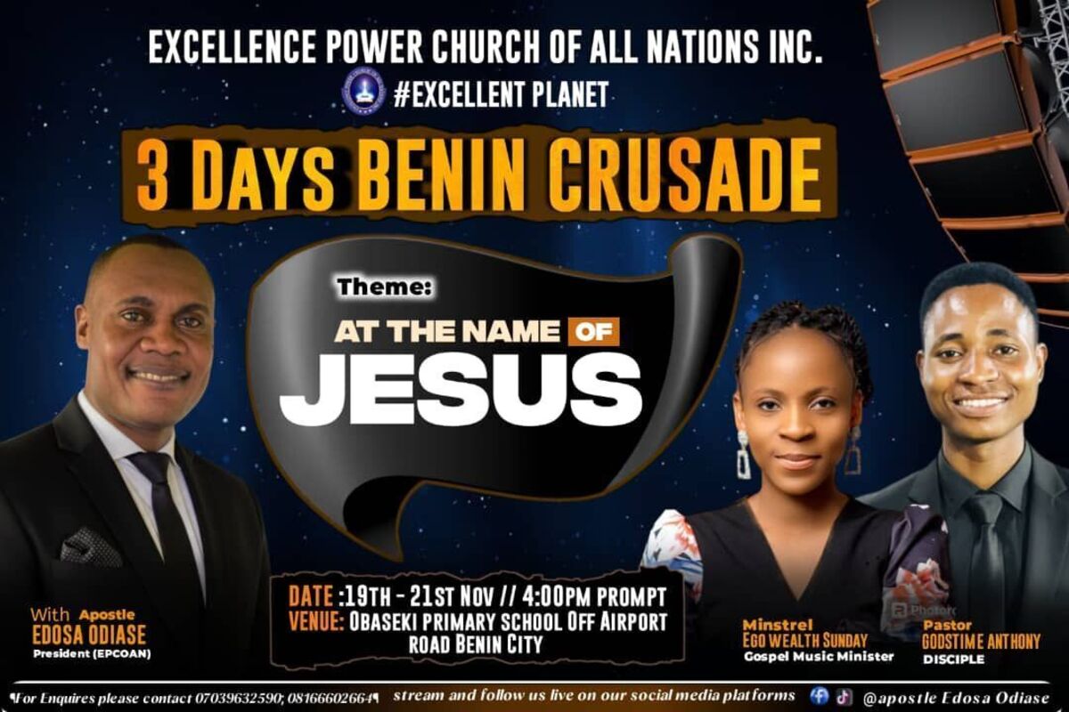 Join us for a powerful spiritual gathering as we come together to subdue kingdoms and establish the Kingdom of Christ (YESHUWA EDOSA) on Earth. πβ¨ Experience an atmosphere charged with faith, worship, and divine breakthrough led by Apostle Edosa Odiase. This event promises an inspiring environment for believers seeking revival and spiritual empowerment. Whether you're looking to deepen your faith or be part of a community dedicated to spiritual growth, this crusade is your opportunity to witness miracles, receive blessings, and uplift your spirit. Donβt miss this life-changing encounter with the power of God! ππ₯