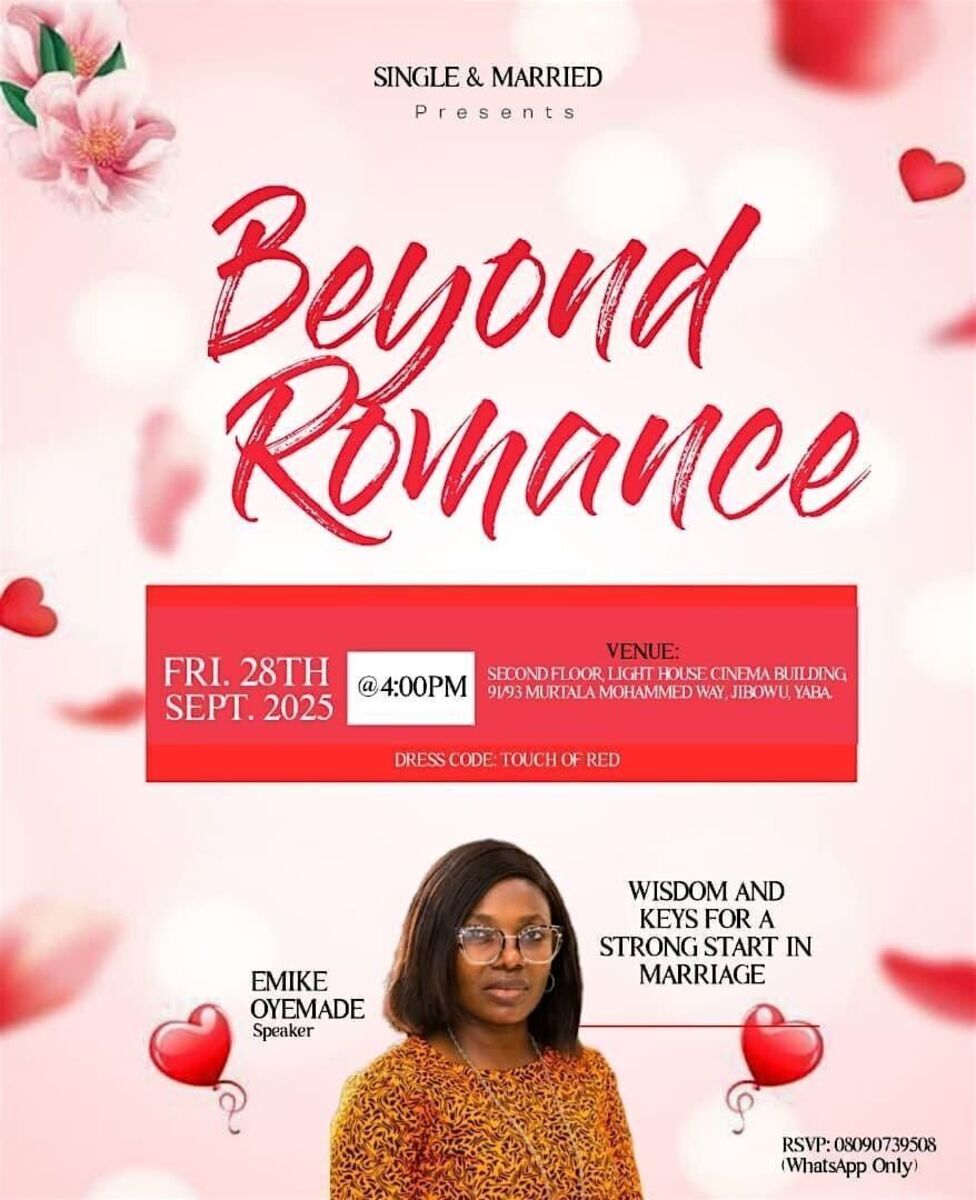 ๐น BEYOND ROMANCE is an inspiring event focused on wisdom and keys for a strong start in marriage. Join us for an enriching experience where love transcends boundaries and expectations. Connect with like-minded individuals and explore new perspectives on relationships. This event promises a journey of self-discovery, inspiration, and meaningful connections. Don't miss this opportunity to go beyond the ordinary and embrace the extraordinary! ๐