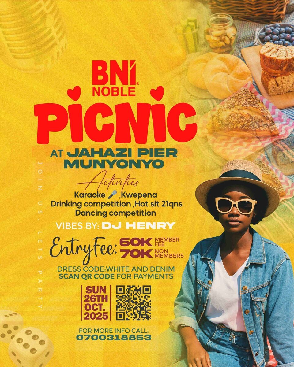 Join us for an exhilarating day of fun and entertainment at the BNI NOBLE PICNIC! Experience a vibrant atmosphere filled with karaoke sessions, lively kwepena games, exciting drinking competitions, and energetic dancing contests. Dress code is White & Denim to keep the vibe stylish and unified. Whether you're looking to showcase your talent or just enjoy a day out with friends, this event promises unforgettable moments and plenty of laughter. Don’t miss out on this perfect blend of music, fun, and socializing! 🎉🎤🥂