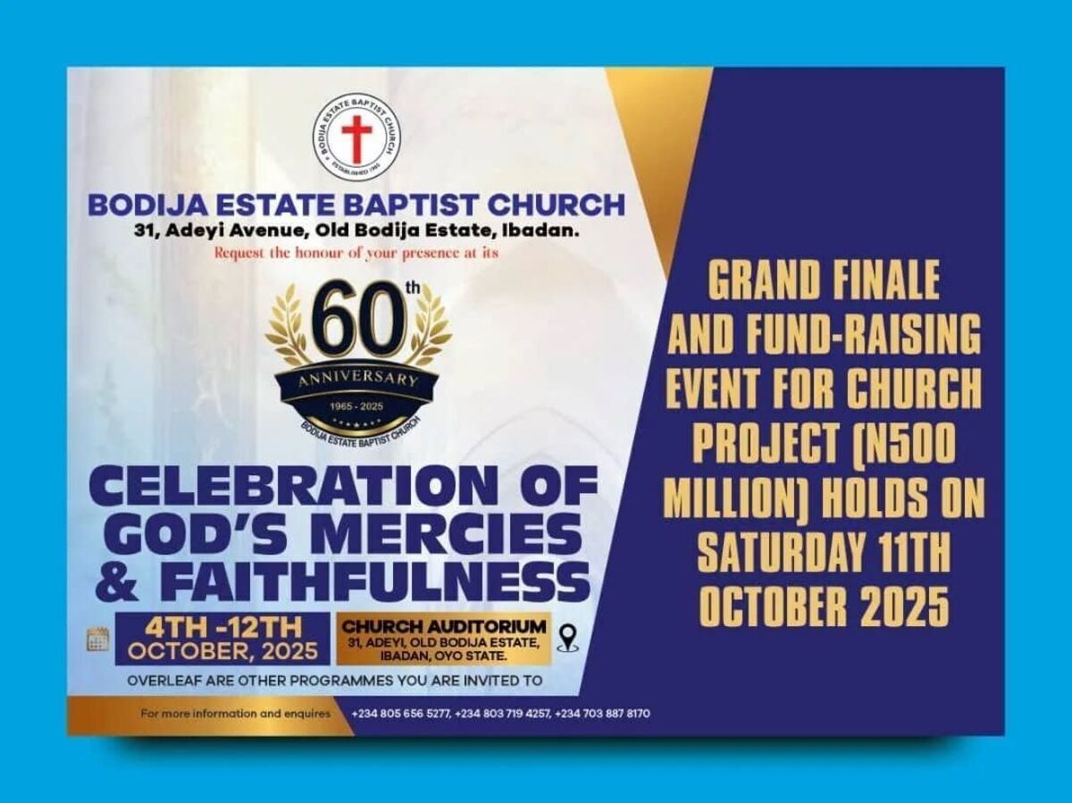 ๐ Join us as we celebrate six decades of faith, grace, and community at the 60th Anniversary of Bodija Estate Baptist Church. Since its inception in 1965, this vibrant church has been a beacon of hope, worship, and impactful testimonies in Ibadan. The week-long festivities will feature joyful worship, reflection, and thanksgiving, marking an incredible journey of spiritual growth and service. Don't miss this historic celebration! ๐ถ๐