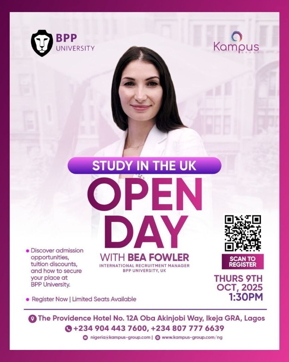 π Discover your pathway to studying in the UK! Join us for an exclusive Open Day hosted by Kampus Group at the elegant Providence Hotel in Lagos. This event is your opportunity to explore admission options, learn about tuition discounts, and get expert guidance from Bea Fowler, the International Recruitment Manager at BPP University, UK. Whether you're a prospective student or a parent, this event offers invaluable insights into studying abroad and securing a spot at one of the UK's leading universities. Donβt miss out β seats are limited! π