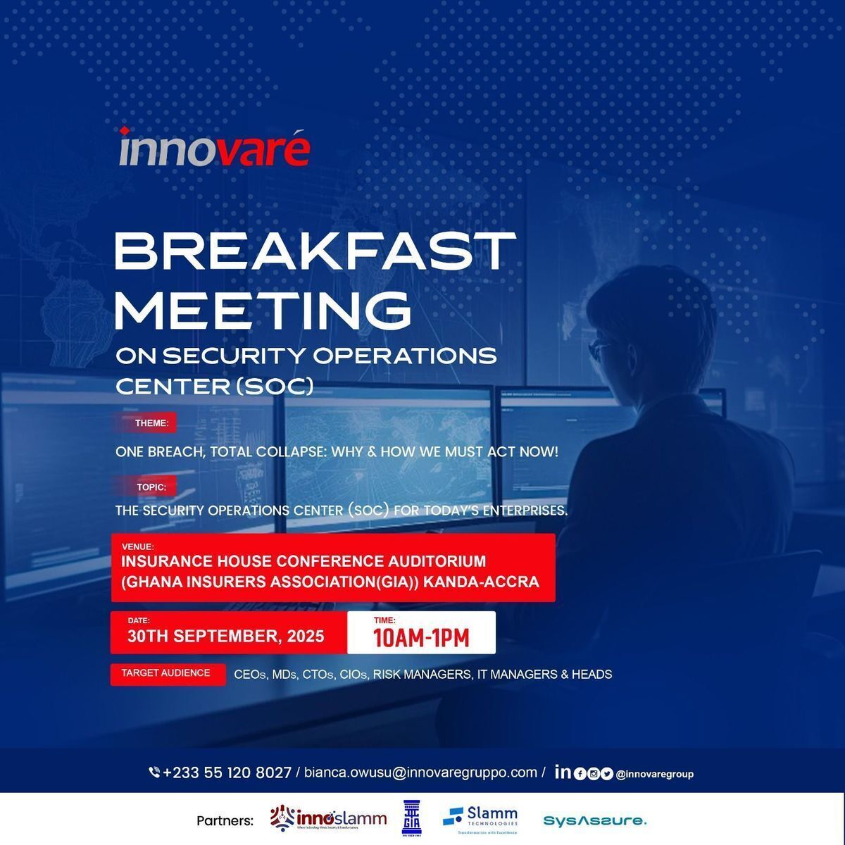 Join us for an exclusive Breakfast Meeting on Security Operations Center (SOC) Readiness hosted by Innovaré. In partnership with Innoslamm, GIA, Slamm Technologies, and SysAssure, this event is designed to strengthen enterprise security in the face of rising cyber threats and regulatory challenges. 🚨