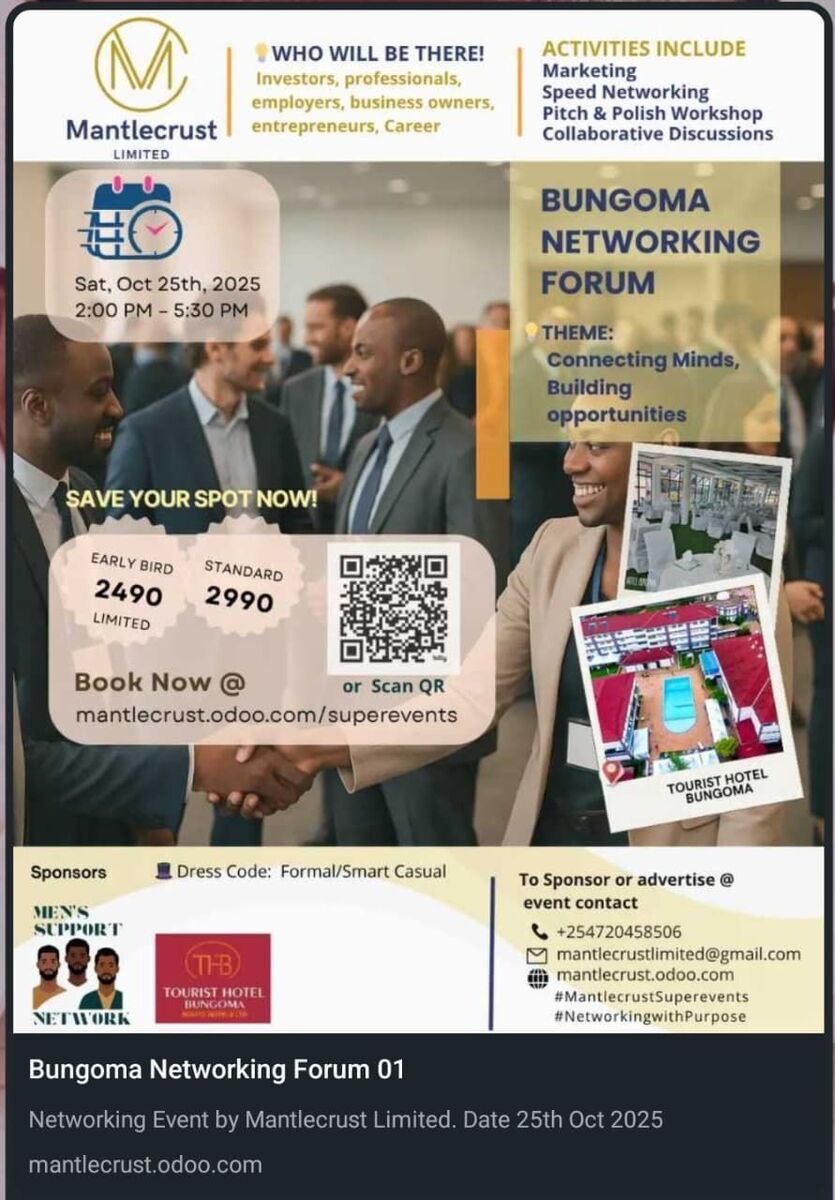 🌟 Join us for the Bungoma Networking Forum! This event is a fantastic opportunity to connect, collaborate, and grow your professional network in Nairobi. Whether you're an entrepreneur, business professional, or simply looking to expand your circle, this forum offers a vibrant environment to meet like-minded individuals. Engage in insightful discussions, share ideas, and explore new opportunities that could propel your career or business forward. Get ready to be inspired and make meaningful connections! 🚀
