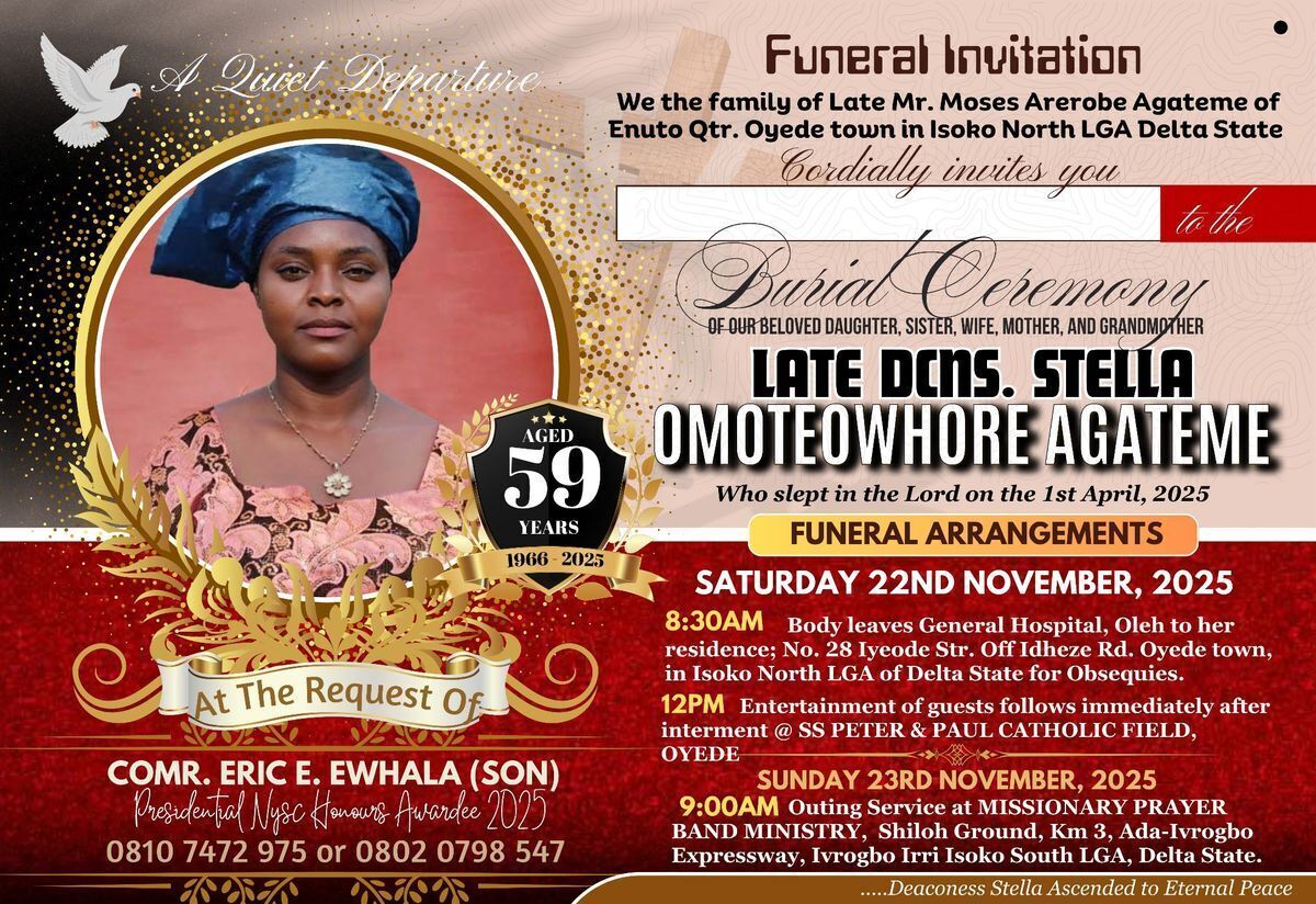 Hosted at a meaningful location in Oyede, Isoko, this event promises a dignified and meaningful farewell. Expect moments of reflection, prayer, and communal solidarity. 🕊️🕯️