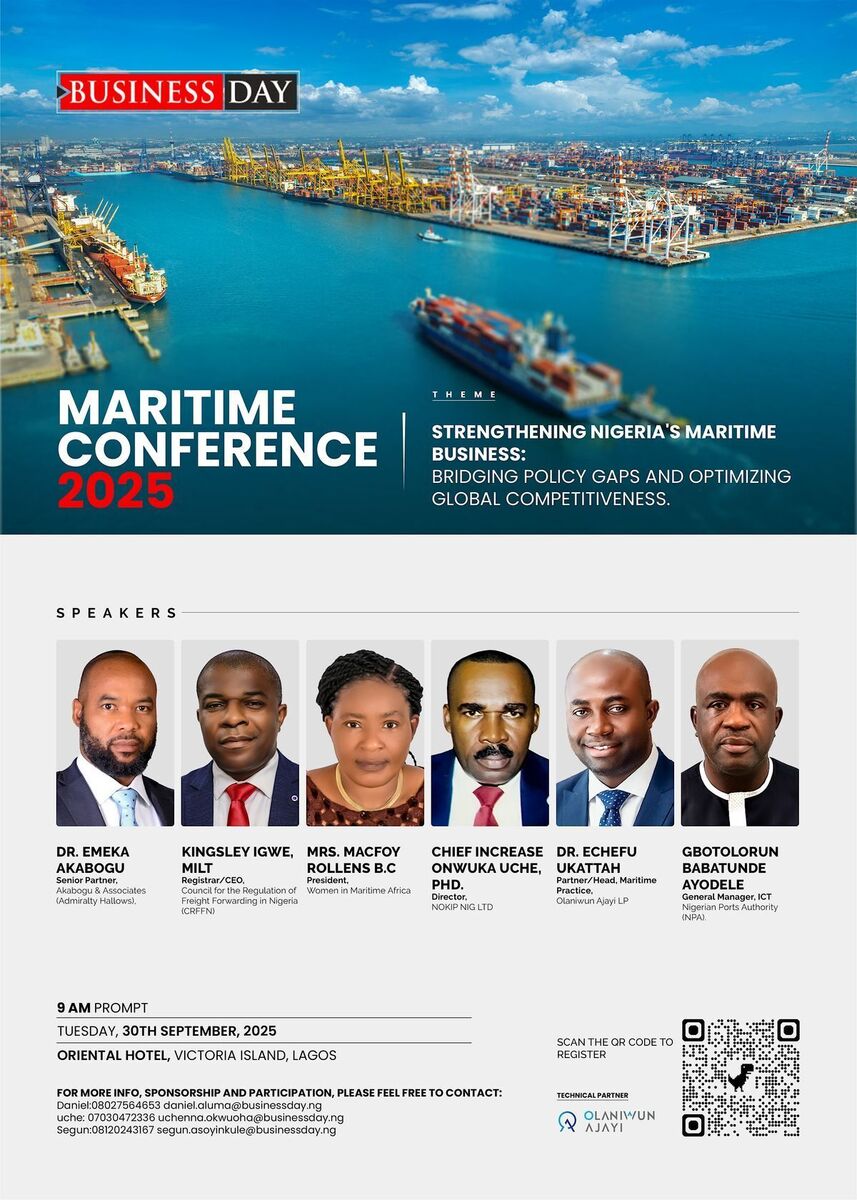 🌊🚢 BusinessDay Maritime Conference 2025 is a premier industry event dedicated to strengthening Nigeria's maritime sector. This high-profile conference brings together policymakers, industry leaders, investors, port operators, logistics professionals, legal experts, and technology innovators. Participants will engage in vital discussions on policy reforms, technological advancements, and investment opportunities to enhance Nigeria’s global maritime competitiveness. Attendees will explore strategies to bridge policy gaps, improve infrastructural efficiency, and position Nigeria as a leading maritime hub in Africa. Whether you're a maritime professional, investor, or policymaker, this conference offers invaluable insights and networking opportunities to propel Nigeria's maritime industry forward. Join us in shaping a sustainable and competitive maritime future! 🚀🌍
