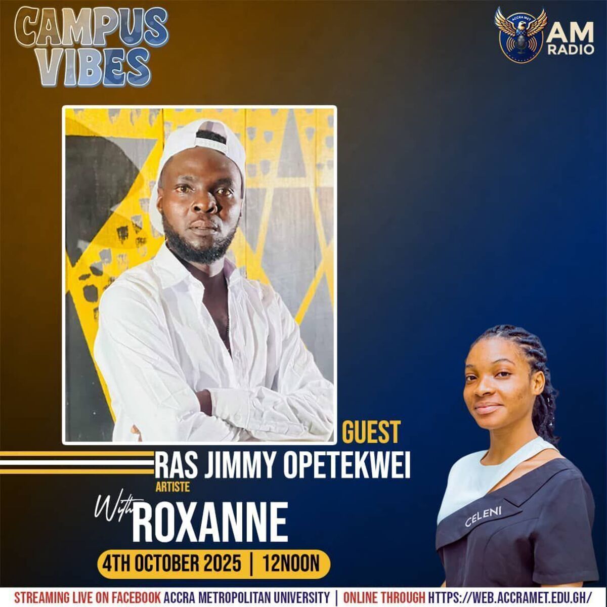 π Get ready for an exciting campus event featuring a special artiste interview on campus vibes! Join us at Accra Metropolitan University for an engaging session on AM radio with James Justin Akoto, also known as Ras Jimmy Opetekwei. Hosted by the talented Roxanne, this event promises an insightful experience into the music and arts scene. Don't miss this unique opportunity to connect with your favorite artists and enjoy lively campus vibes! πΆβ¨