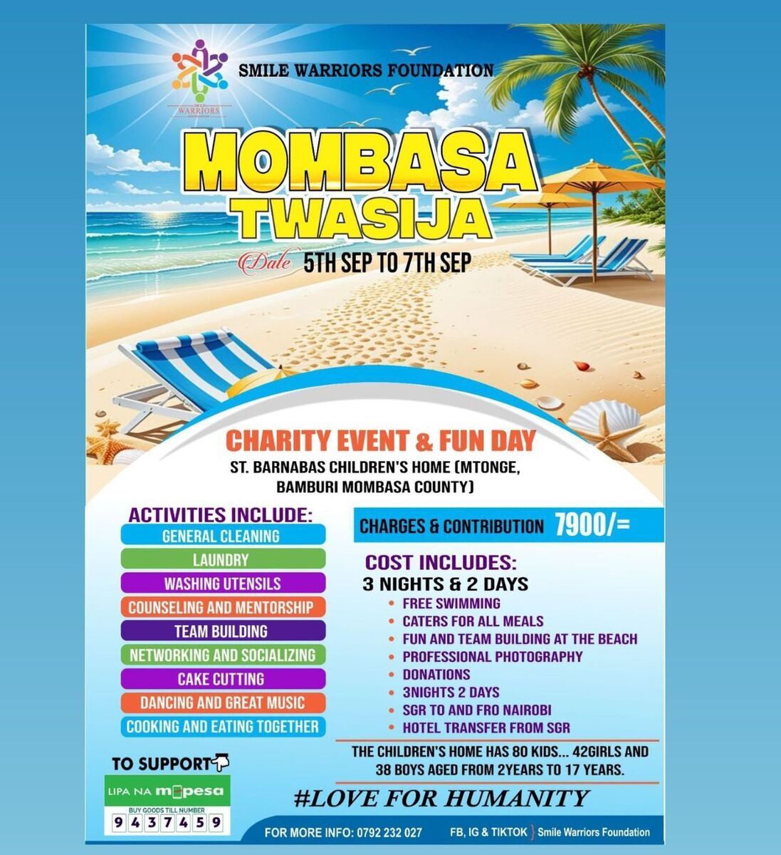Join us for an exciting Charity Event & Fun Day happening from September 5th to 7th at St. Barnabas Childrenโs Home, Mombasa! This weekend promises a perfect blend of giving back, making new connections, and beachside fun โ all supporting 80 incredible children. ๐