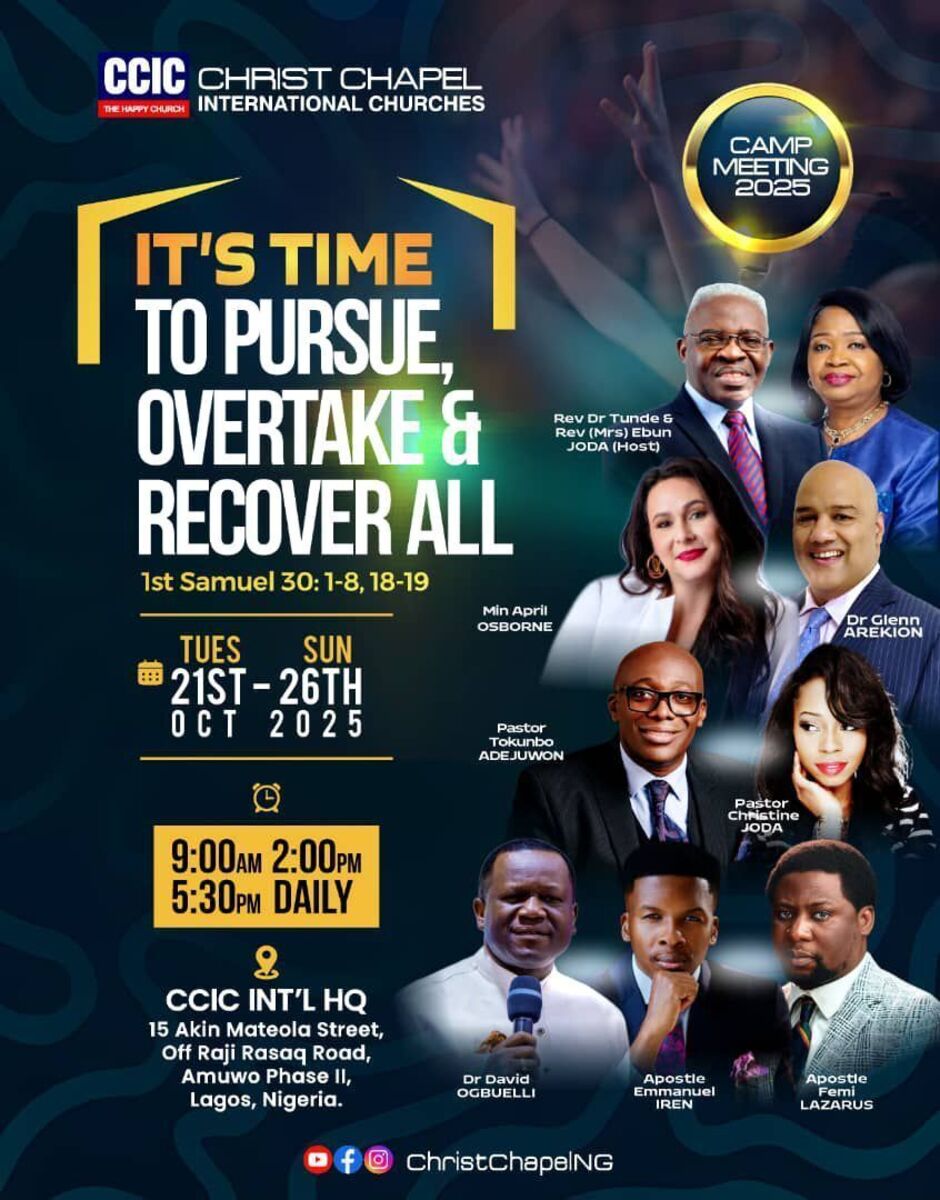 Join us for the highly anticipated Christ Chapel International Churches Camp Meeting 2025 at the vibrant location of Aguda, Lagos. This spiritual gathering promises an atmosphere filled with divine inspiration, powerful worship sessions, and life-transforming messages. Engage with a community of believers, participate in enriching activities, and experience a profound encounter with God. โจ๐