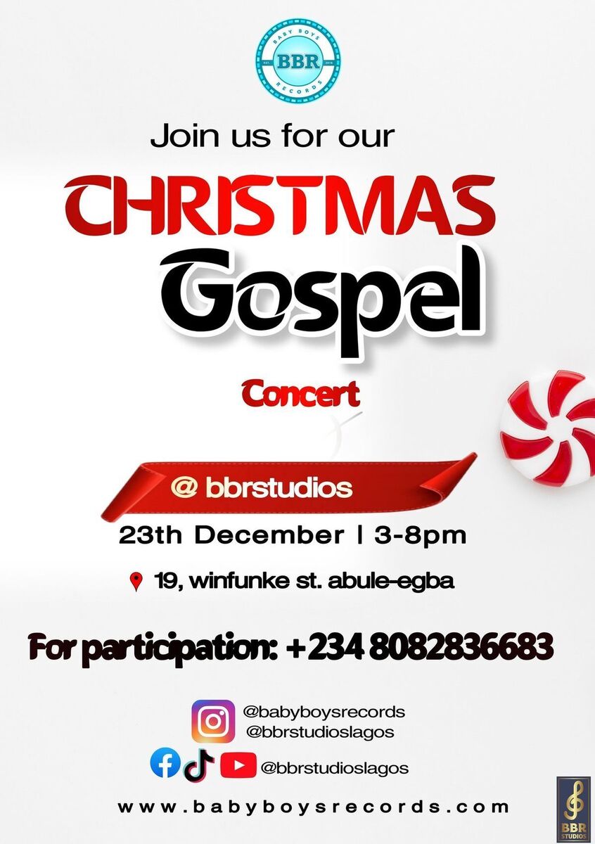 πβ¨ Get ready for an unforgettable evening of worship and celebration! Join us at the Christmas Gospel Concert hosted at BBR Studios on 23rd December, 2025 from 3:00 pm to 8:00 pm at 19, Winfunke St., Abule-Egba. π΅ Letβs fill the air with joyful melodies and festive spirit! π