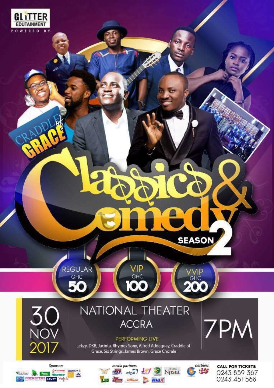 CLASSICS AND COMEDY SEASON 2...ITS THE BEST PLATFORM TO WITNESS THE BEST OF ACTS FROM GHANA ON ONE STAGE ,GREAT ACTS LIKE ALFRED PATRICK ADDAQUAY (THE PIANIST),GRACE CHORALE CHOIR, SIX STRINGS AND COMEDIANS LIKE DKB,LEKZY DE COMIC,JACINTA,ID JAMES BROWN,PAMELA THE POET,CRADLE GRACE ,RHYME SONY, AND OTHER SURPRISING ACTS....